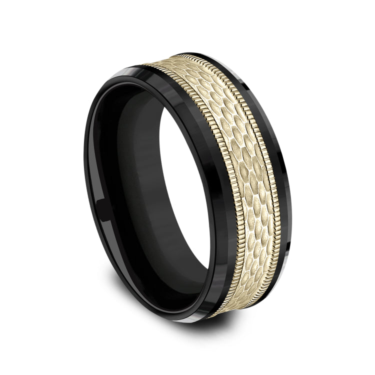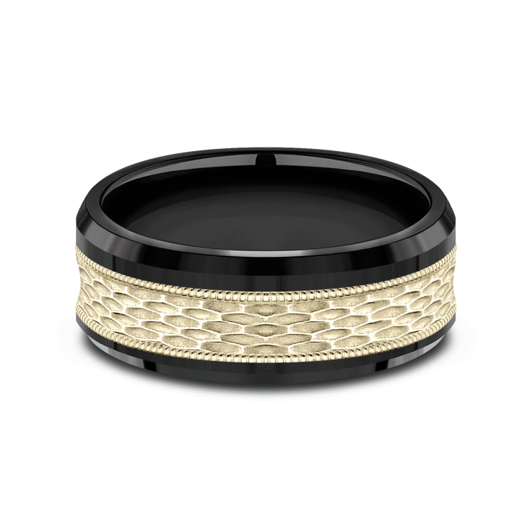 8mm, Comfort fitBlack Titanium and 14K Yellow GoldMesh pattern with milgrain detail, polished bevel edges
