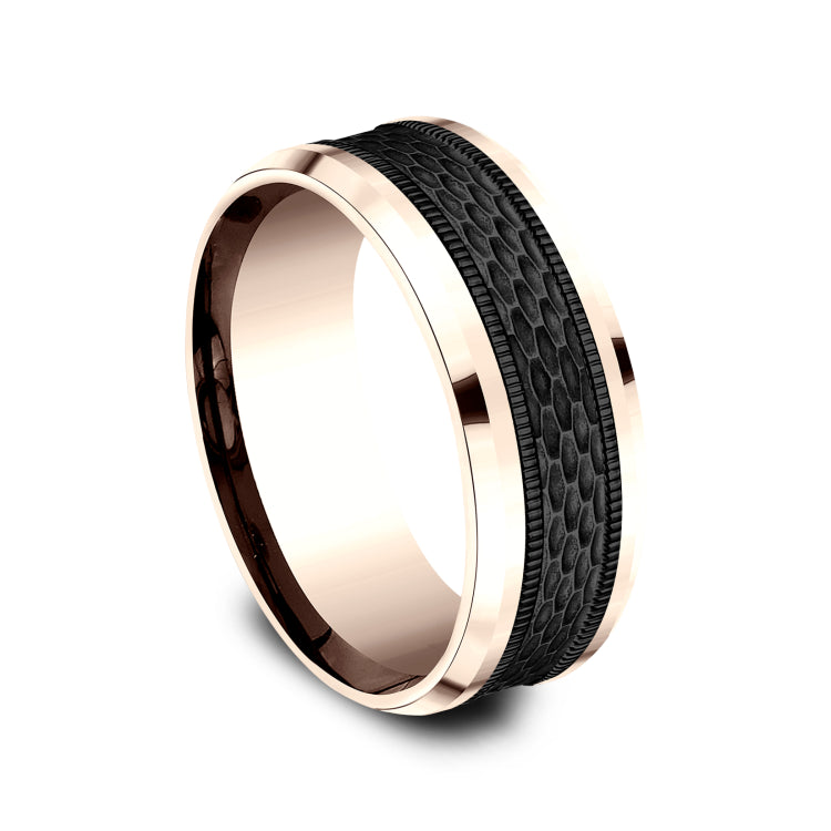 8mm, Comfort fit14K Rose Gold and Black TitaniumMesh pattern with milgrain detail, polished bevel edges