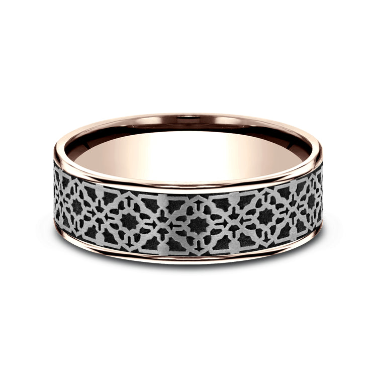 7.5mm, Comfort fit14K Rose Gold and Grey/Black TitaniumAztec pattern, thin edges