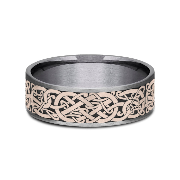 7.5mm, Comfort fitGrey Tantalum and 14K Rose GoldViking knot patterned center, thin edges