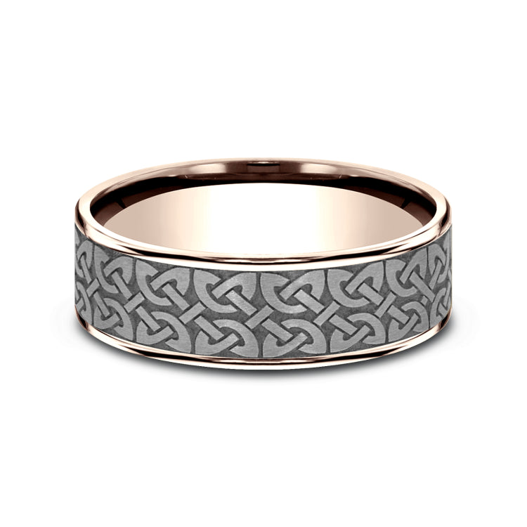 7.5mm, Comfort fit14K Rose Gold and Grey TantalumCeltic knot designed center, thin polished edges