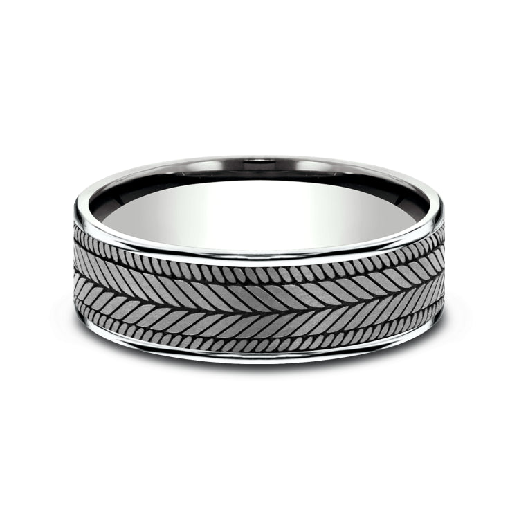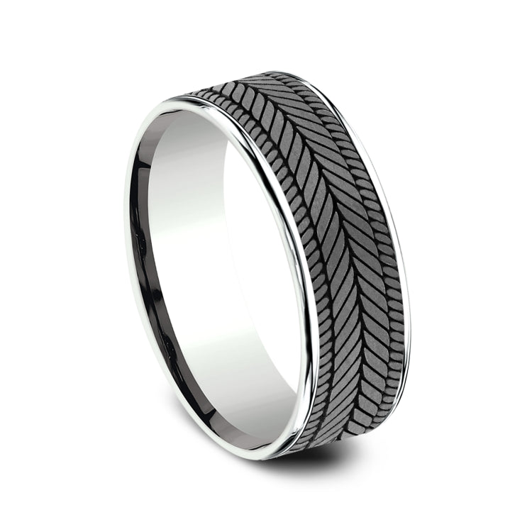 7.5mm, Comfort fit14K White Gold and Grey TantalumChevron weave pattern, thin edges