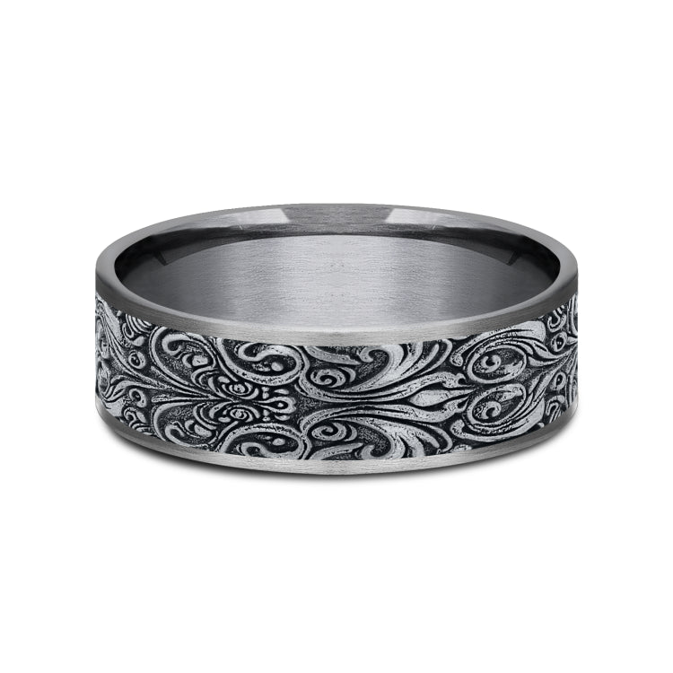 7.5mm, Comfort fitGrey Tantalum and 14K White GoldBaroque frame pattern, thin edges