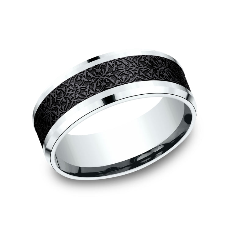8mm, Comfort fit14K White Gold and Black TitaniumOttoman pattern, polished drop bevel edges