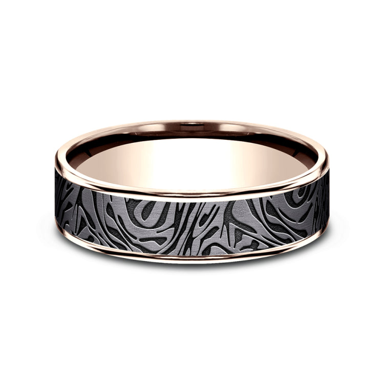 6.5mm, Comfort fit14K Rose Gold and Darkened TantalumFaux mokume pattern, polished thin edges