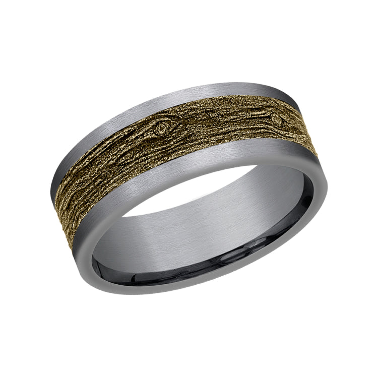 8mm, Comfort fitGrey Tantalum and 14K Yellow GoldWood motif center, straight edges