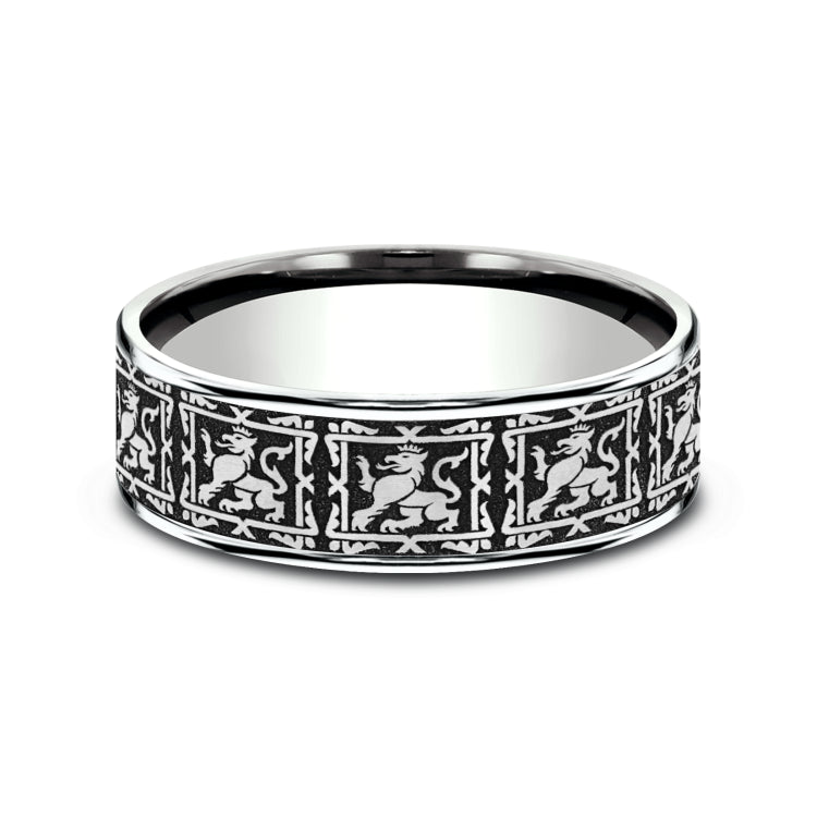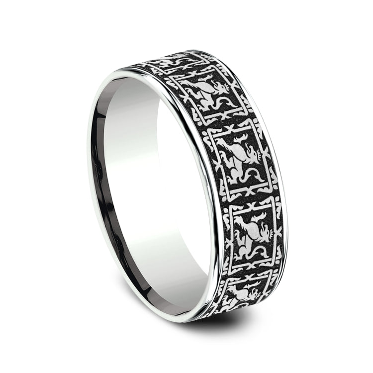 7.5mm, Comfort fit14K White Gold and Grey/Black TitaniumGriffin pattern, thin edges