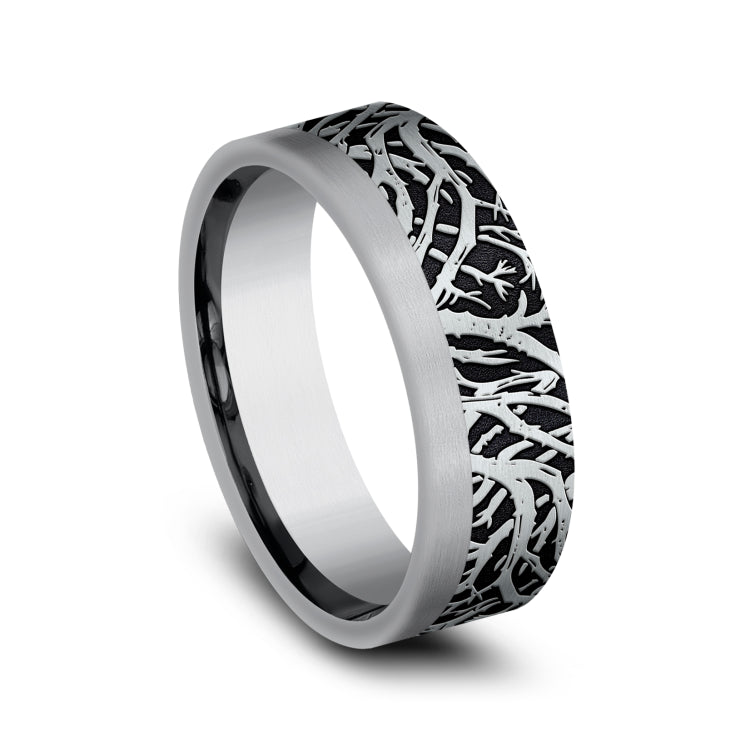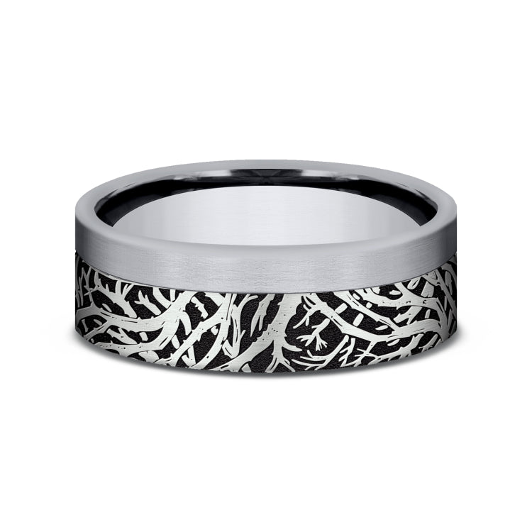7mm, Comfort fit14K White Gold and Grey TantalumForest branch pattern, one satin edge