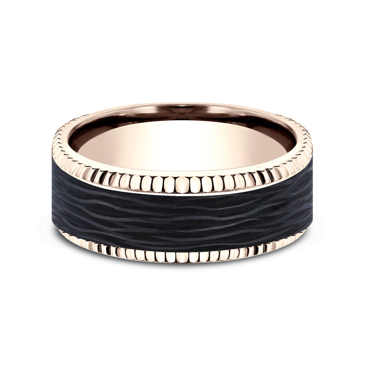 8mm, Comfort fit14K Rose Gold and Forged Carbon FiberForged carbon fiber center, fluted bevel edges