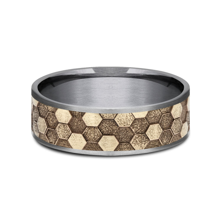 7.5mm, Comfort fitGrey Tantalum and 14K Yellow GoldHoneycomb pattern, thin edges