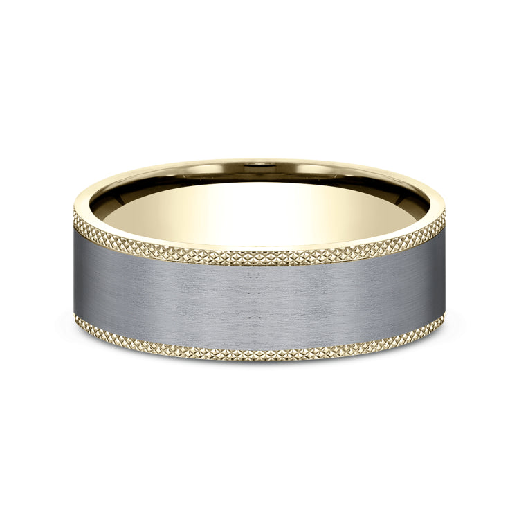 7mm, Comfort fit14K Yellow Gold and Grey TantalumSatin finish center, knurl detailed edge