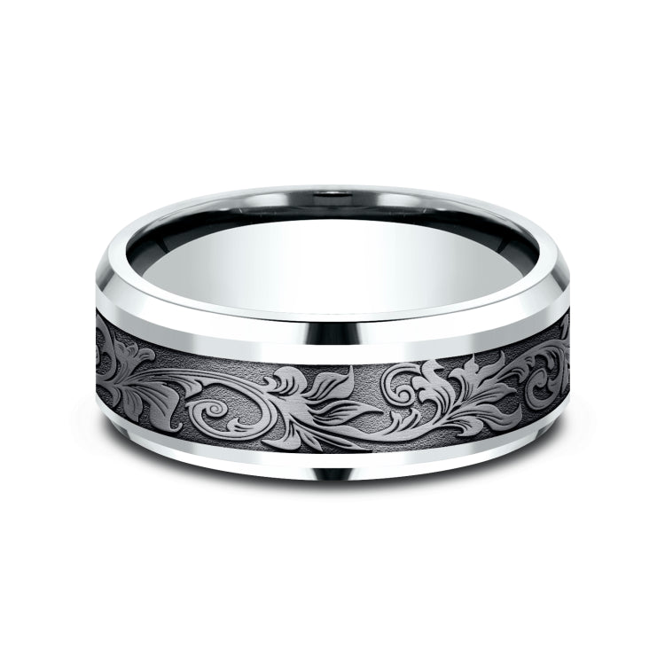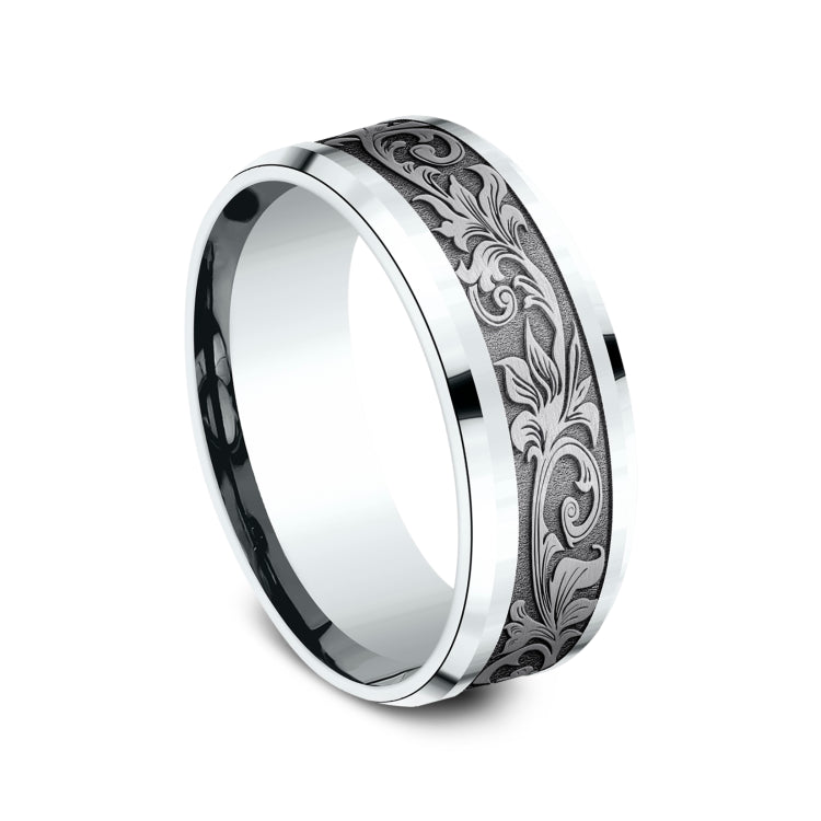 8mm, Comfort fit14K White Gold and Grey TantalumVintage script pattern, polished drop bevel edges