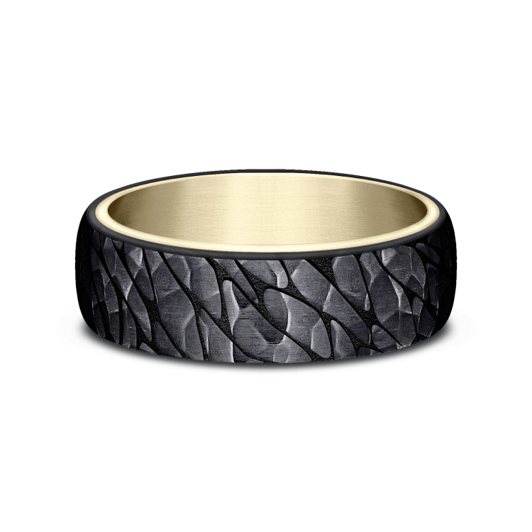 6.5mm, Comfort fit14K Yellow Gold and Black TitaniumPebble pattern with hammered finish