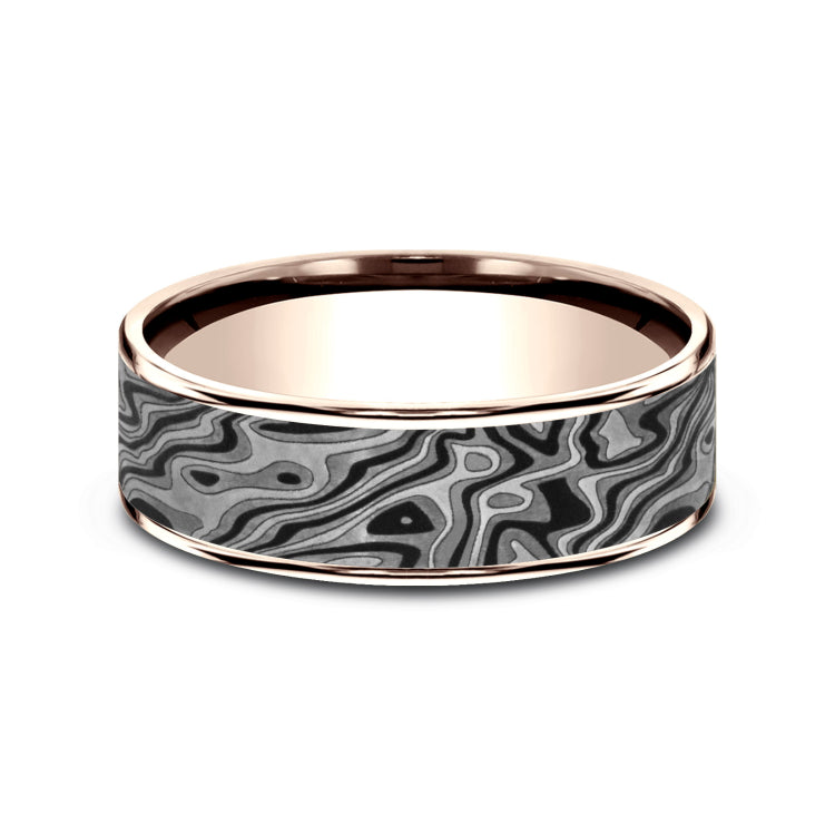 7.5mm, Comfort fit14K Rose Gold and Grey TantalumMokume patterned center, thin polished edges