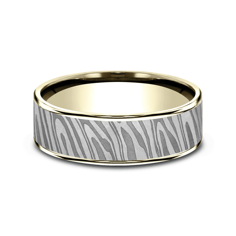 7.5mm, Comfort fit14K Yellow Gold and Grey TantalumUnique Tamascus designed center, thin edges