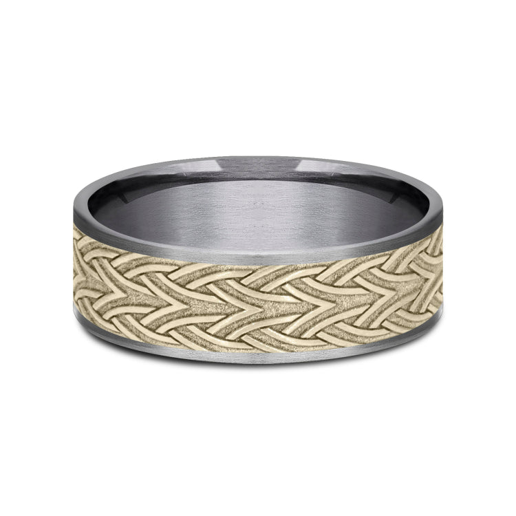 7.5mm, Comfort fitGrey Tantalum and 14K Yellow GoldCeltic arrow knot designed center, thin edges