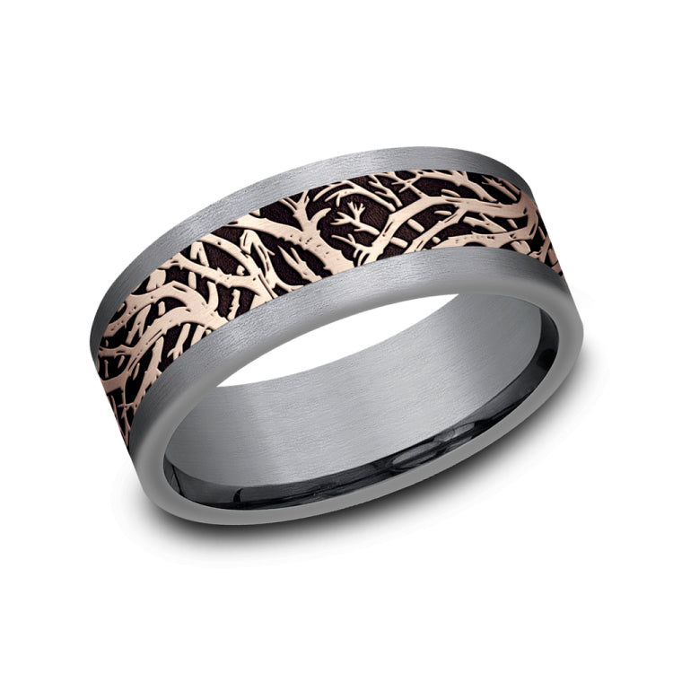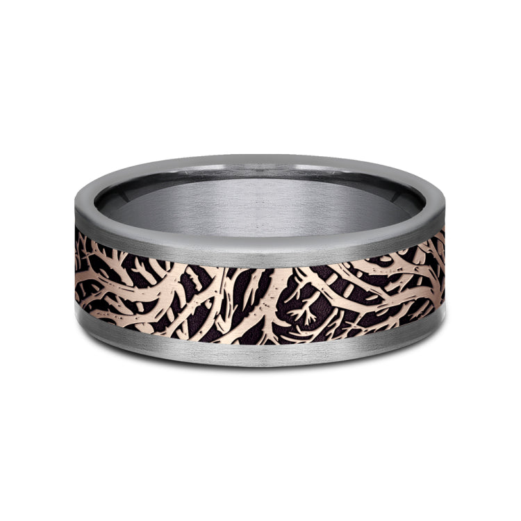8mm, Comfort fitGrey Tantalum and 14K Rose GoldForest branch pattern, straight edges