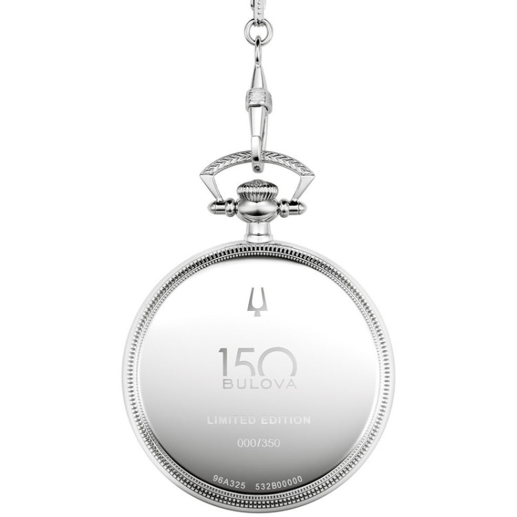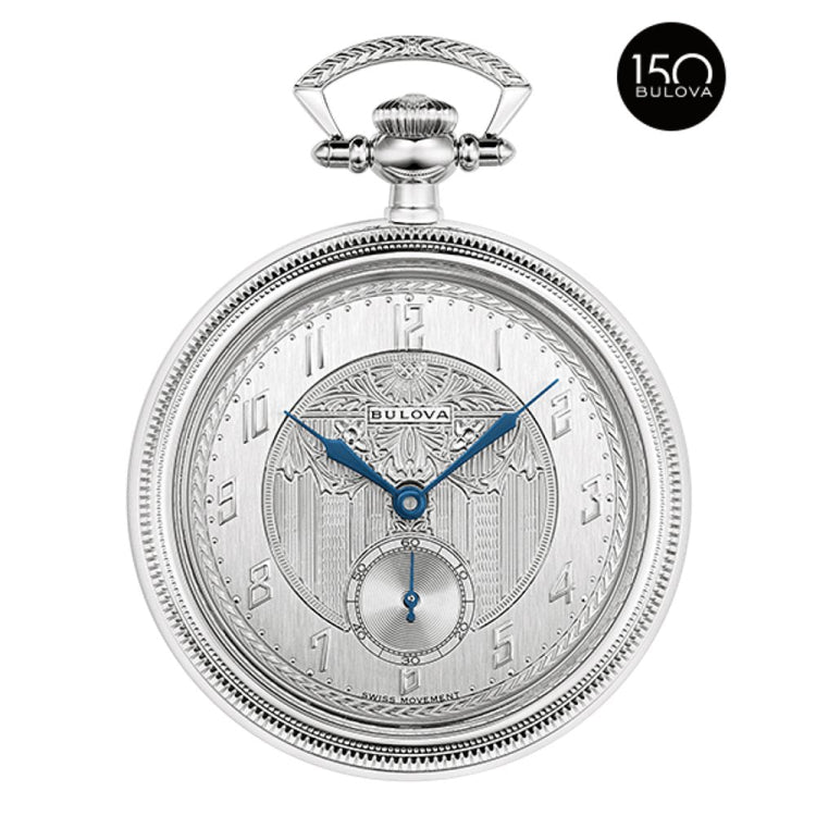 The Limited Edition Bulova Pocket Watch from the Archive Series takes inspiration from several Art Deco designs from the 1920s, celebrating the artistic craftsmanship that has long defined Bulova. The pocket watch features a coin-edge textured silver-tone stainless steel case with a textured bow and is finished with a sapphire crystal. The 15.8" custom link chain was inspired by the original vintage pocket watch and is finished with a lobster claw and spring ring that was specially created for this timepiece. The stunning sterling silver dial reproduces the incredible work of early Bulova artisans with blue hands, intricately engraved central artwork, and dramatic numerals set against a brushed hour ring. The case back is etched with the 150th anniversary logo and is individually numbered to mark each limited-edition piece.