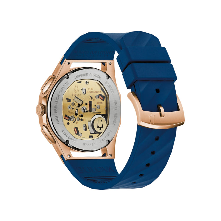 Seamlessly merging iconic Bulova watch designs with the dynamic musicality of Marc Anthony, this new addition to the Marc Anthony collection puts the legendary artist’s spin on the groundbreaking men’s CURV chronograph. With a rose gold-tone stainless steel case with open lugs and pushers, the CURV features the world’s first curved chronograph movement, with a dramatic curved sapphire crystal and a curved case back that gives it an effortless presence on the wrist. Mirroring the bold rhythm of Anthony’s music, the translucent blue five-hand chronograph dial brings a refreshing palette to the CURV collection and offers a glimpse at the curved chronograph movement featuring our proprietary high-precision 262 kHz quartz technology with exceptional accuracy of seconds per year. The 1, 3, and 5 hours marked by applied rose gold-tone markers highlight Marc’s personally significant numbers. Three sub-dials display the elapsed chronograph time in 12-hour, 60-minute, and 60-second intervals.