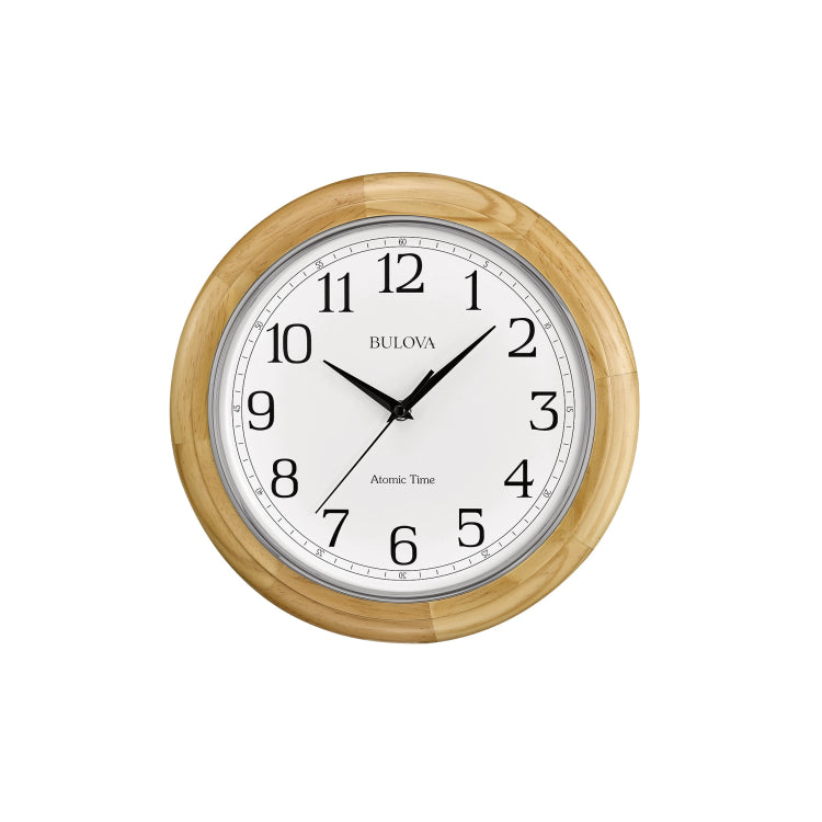 Solid hardwood case finished in a clear natural stain to enhance the natural grain. A plated and polished silver bezel holds the convex glass lens and protects the white dial that accents the case, bold clear numbers enhance the visibility for reading the time. The convex glass allows for extra safety in school and commercial settings. The quartz movement receives the Atomic Time signal every other hour from Colorado to keep the most accurate time available. No need to adjust for daylight savings time. Clock uses (1) AA battery, not included.