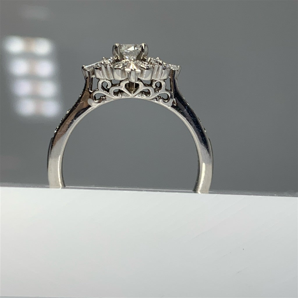 14Kt White Gold Halo Vintage Engagement Ring Complete with Center DiamondCenter:1/3ct Natural Round Diamond32 - Diamond Rounds 0.005 CT4 - Diamond Taper Baguette 0.225 CT