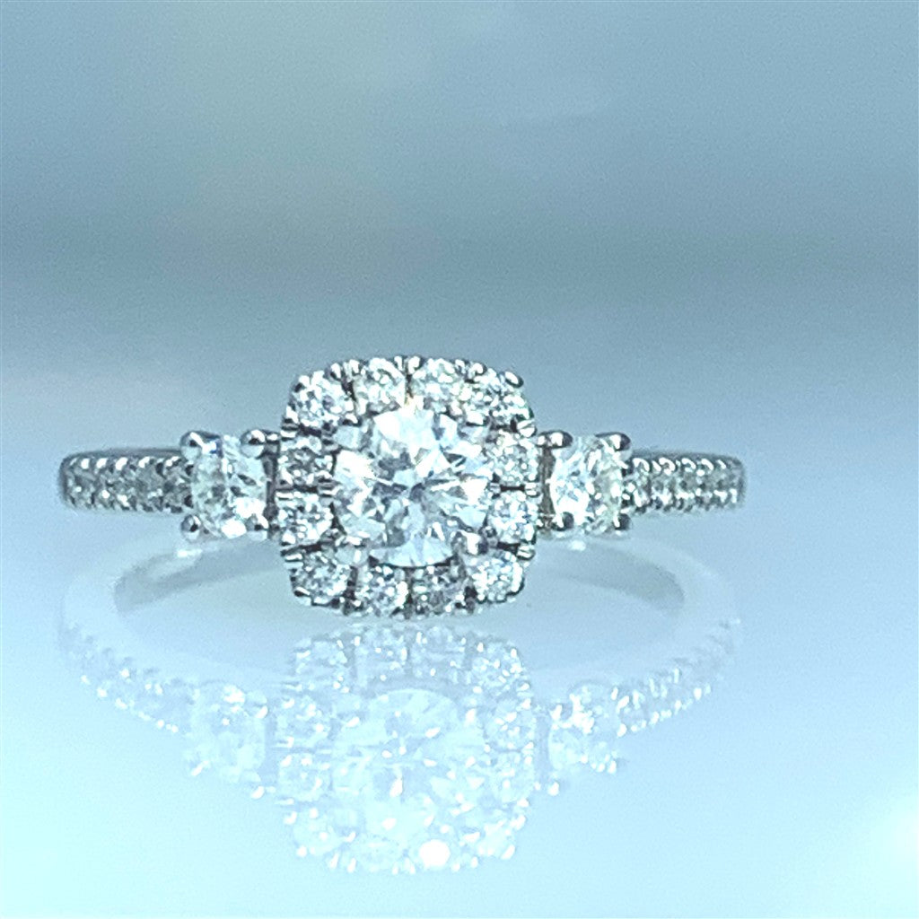 14Kt White Gold Three-Stone Halo Engagement Ring Complete with Center Diamond 0.61 tdwMatching Band 100-00929