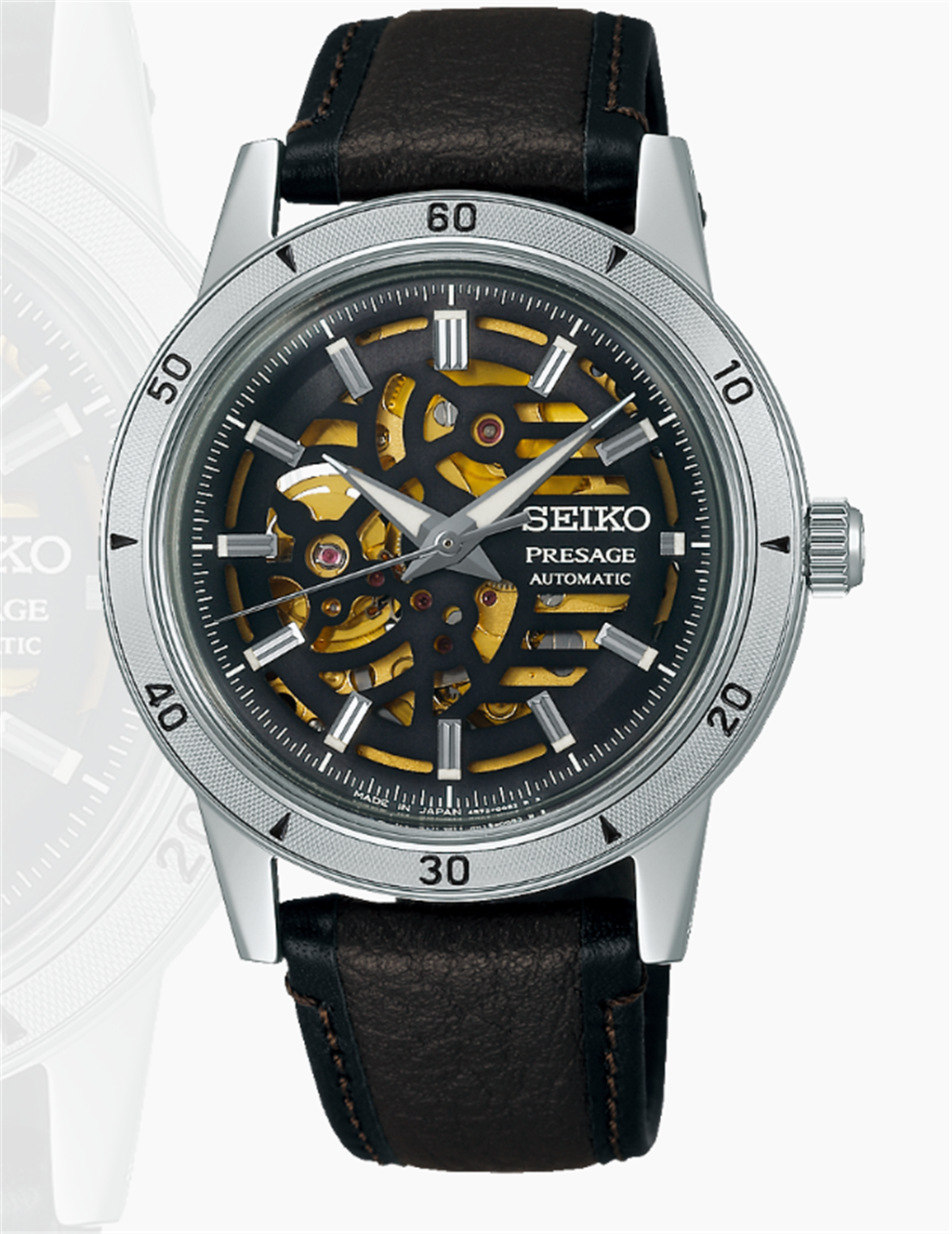 Seiko's Presage Style 60s is inspired by retro biker looks with a cutout dial pattern resembling a vintage motorcycle engine and its inner workings. Style #SSA461