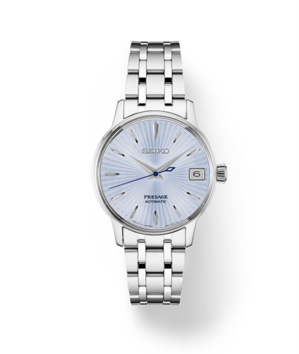 From the Presage Cocktail Time Collection. Offering the finest in Japanese mechanical watchmaking, the Presage Collection blends precision technology with superior craftsmanship and design. Inspired by the delights of a cocktail bar, this sophisticated watch features an ice blue dial with pressed pattern, gloss finish and date calendar. The 23-jewel movement, with manual and automatic winding capability, beats at a frequency of 21,600 vibrations per hour, with a power reserve of approximately 41 hours. Crafted of stainless steel, this elegant timepiece includes a box-shaped crystal, screwdown see-through caseback, and double deployment clasp with push button release. 5 bar, 50M Water Resistant