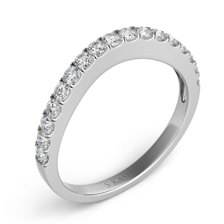 This band is available in 14K White Gold. There are a total of 17 stones. There are Rounds with a total carat weight of 0.43 set in a Micro Prong setting.