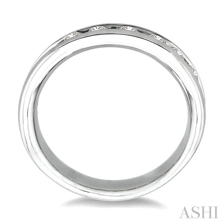 Start your new life together with this elegant wedding band. Crafted in 14 karat white gold, this classic band features 11 sparkling channel set round cut diamonds in a semi-circle. reflecting brilliant flashes of light from diamonds are like the melody of your romance to her heart always. The total diamond weight is 1 Ctw.