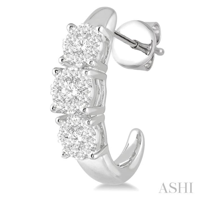 An alluring pair of Lovebright diamond earrings; these offer elegance to any ensemble. Each earring features 3 circular mounts, one large in the center flanked by a smaller mount on either side of it. A invisible set round cut diamond embellishes the center of each of the 6 mounts. This is bounded by 8 small invisible set round cut diamonds, a total of 48 diamonds on all the mounts. A push back clasp secures the earrings in place. The earrings are framed in 14 karat white gold. Total diamond weight is 1/2 Ctw.