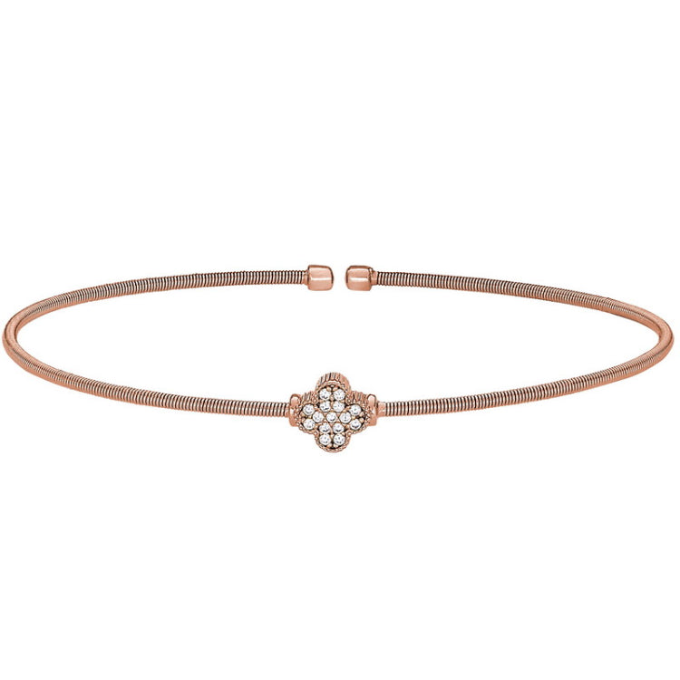 Rose gold finish sterling silver cable cuff bracelet with simulated diamond clover design