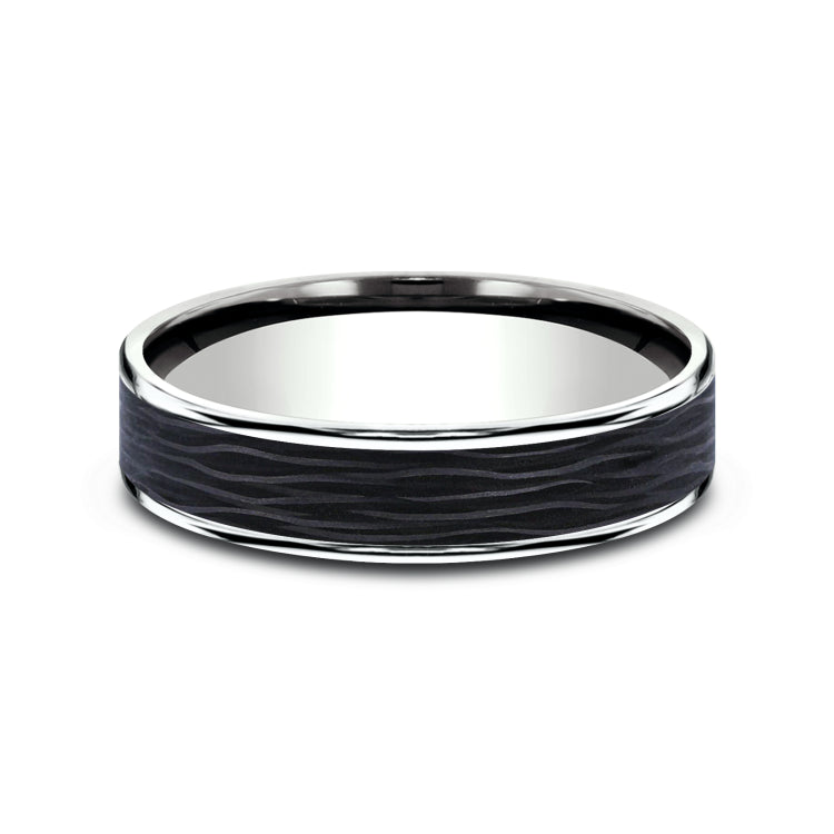 5.5mm, Comfort fit14K White Gold and Forged Carbon FiberForged carbon fiber center, thin edges